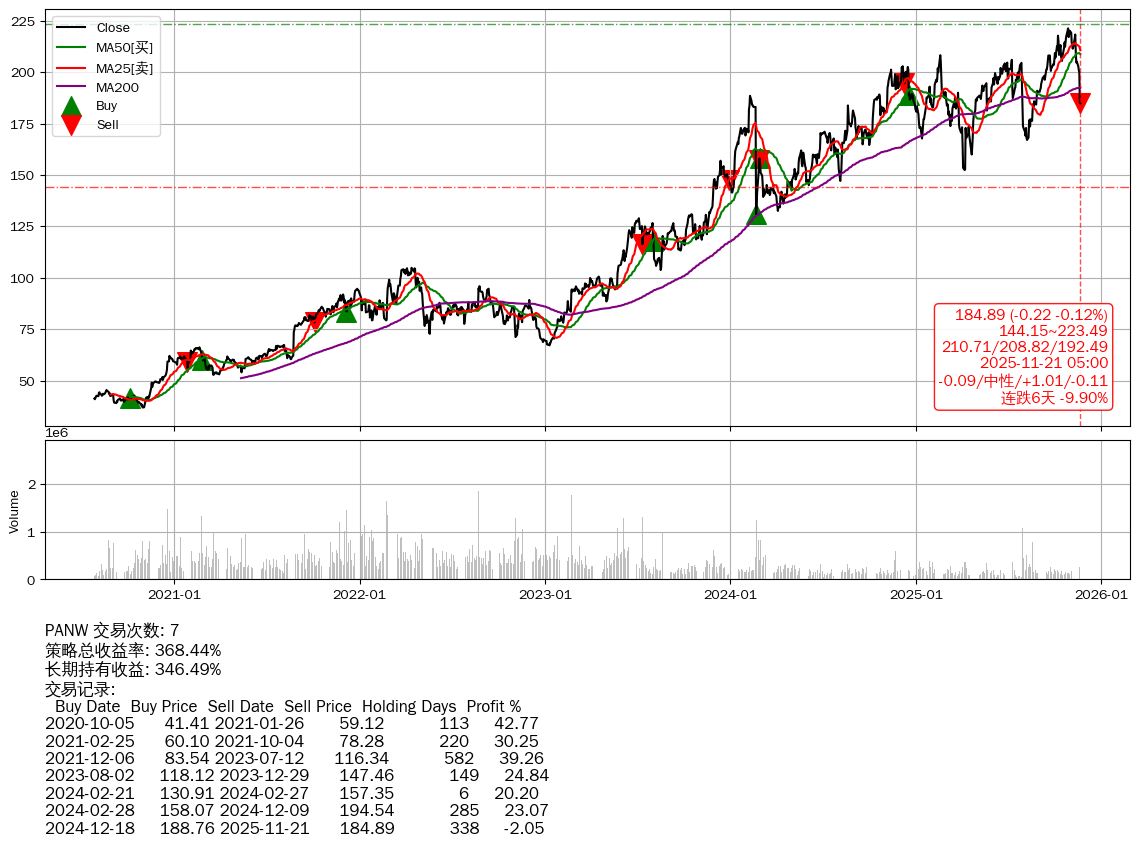 | 5 | ★PANW | $182.86(-2.25 -1.22%) 11-21 14:59 185.11 11-20 | 📉连跌6天 -9.90% 📉回撤 10-28 -16.47% (23天) 221.34(10-27)→184.89(11-20) | +368.44% | +346.49% | +21.96% | 7 | 中性/1.01/-0.11 | 2020-07-27~2025-11-21 |