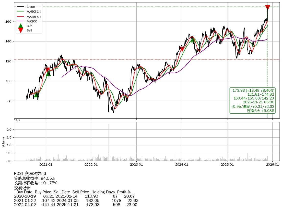| 32 | ROST | $174.00(+13.51 +8.42%) 11-21 14:59 160.49 11-20 | 📈涨破 MA5/10 均线 📈涨破 52周高点 (174.82) 📈连涨5天 +9.08% | +94.55% | +101.75% | -7.20% | 3 | 偏多/0.31/2.33 | 2020-07-27~2025-11-21 |