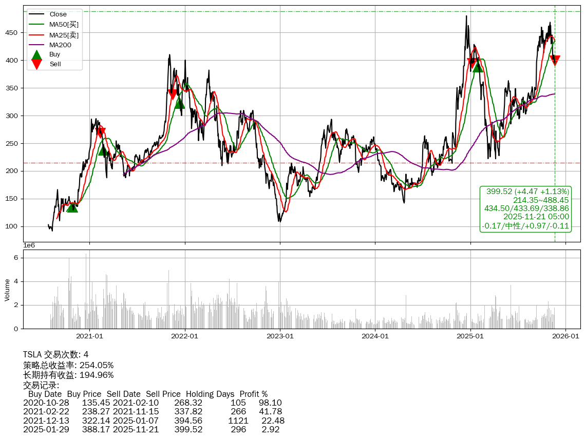 | 9 | ★TSLA | $391.05(-3.98 -1.01%) 11-21 14:59 395.03 11-20 | 📉回撤 2024-12-17 -16.74% (338天) 479.86(2024-12-16)→221.89(04-07) | +254.05% | +194.96% | +59.09% | 4 | 中性/0.97/-0.11 | 2020-07-27~2025-11-21 |