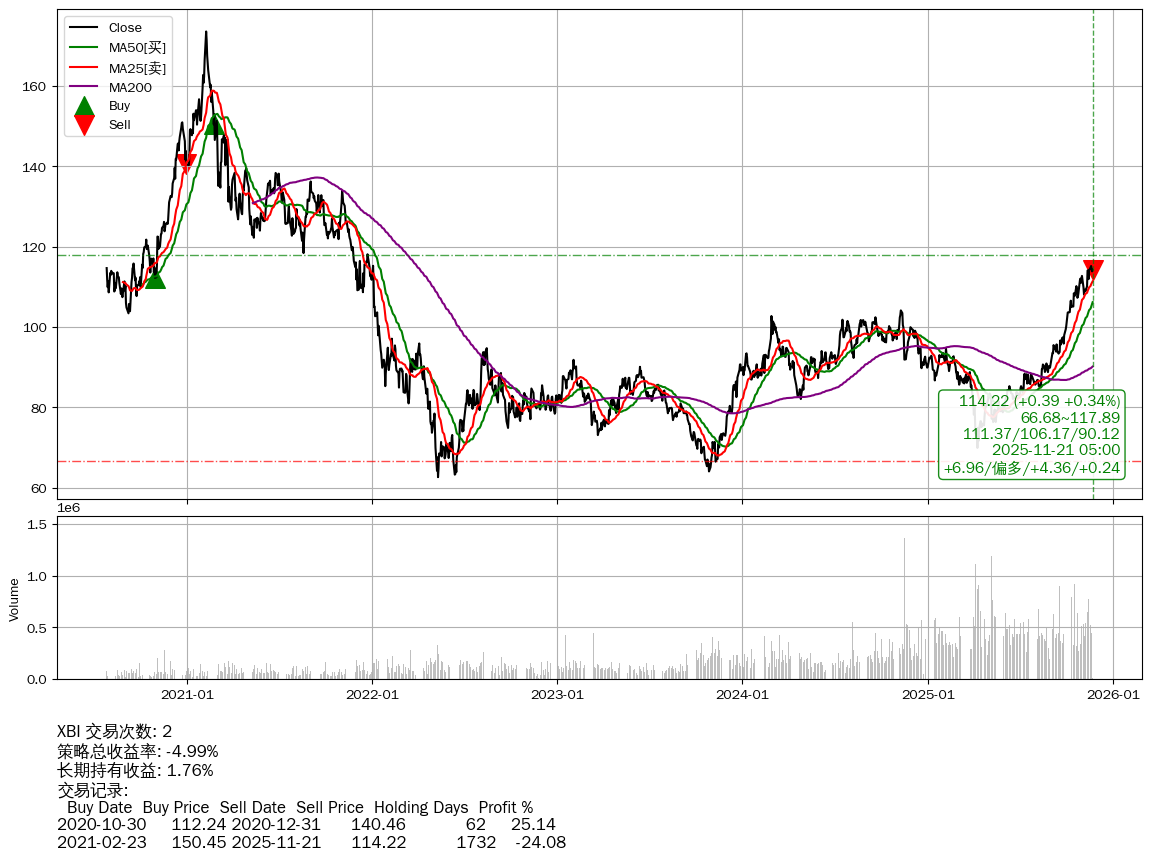 | 48 | ★XBI | $116.65(+2.81 +2.47%) 11-21 14:59 113.84 11-20 | 📉回撤 2021-02-08 -34.20% (1746天) 173.59(2021-02-07)→62.59(2022-05-10) | -4.99% | +1.76% | -6.76% | 2 | 偏多/4.36/0.24 | 2020-07-27~2025-11-21 |