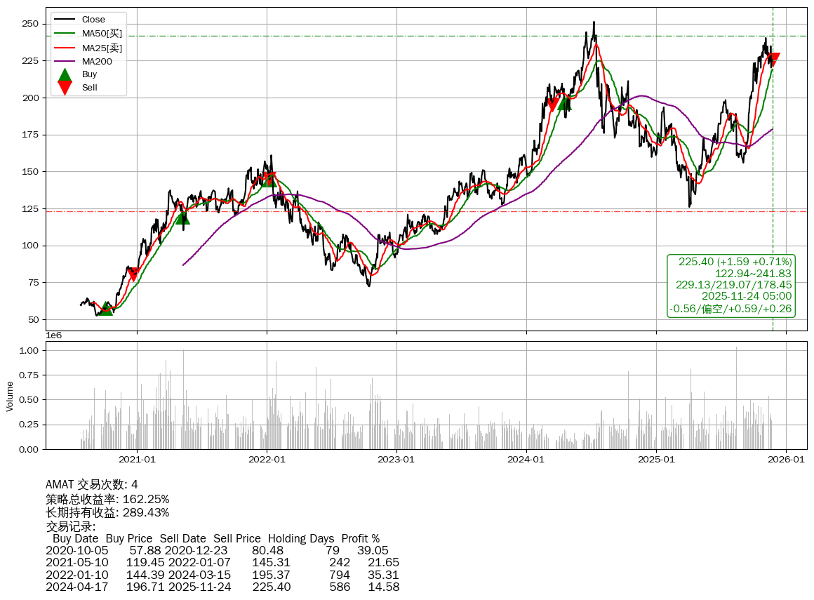 | 18 | ★AMAT | $230.92(+6.97 +3.11%) 11-24 14:59 223.95 11-21 | 📉回撤 2024-07-10 -10.31% (501天) 251.31(2024-07-09)→125.95(04-03) | +162.25% | +289.43% | -127.17% | 4 | 偏空/0.59/0.26 | 2020-07-27~2025-11-24 |