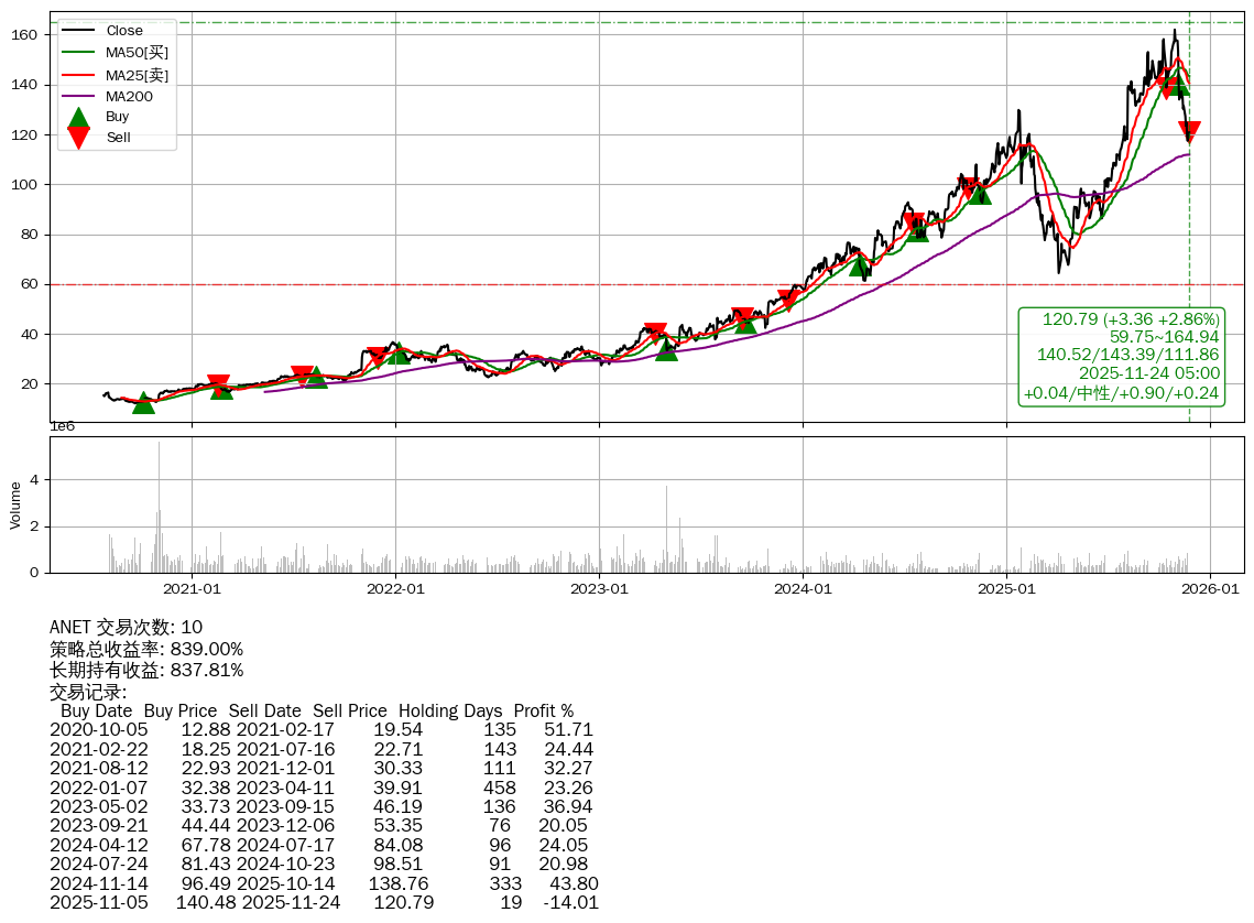 | 2 | ★ANET | $122.14(+4.71 +4.01%) 11-24 14:59 117.43 11-21 | 📉回撤 10-29 -25.43% (25天) 161.99(10-28)→117.43(11-20) | +839.00% | +837.81% | +1.19% | 10 | 中性/0.9/0.24 | 2020-07-27~2025-11-24 |