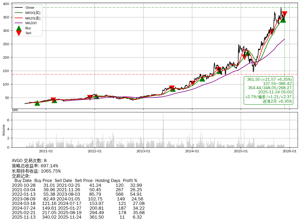 | 3 | ★AVGO | $377.71(+37.75 +11.10%) 11-24 14:59 339.96 11-21 | 📈涨破 MA5/10/25/50 均线 📈连涨2天 +6.35% 📉回撤 10-29 -6.33% (25天) 385.92(10-28)→339.93(11-20) | +697.14% | +1065.75% | -368.61% | 8 | 偏多/1.21/2.37 | 2020-07-27~2025-11-24 |