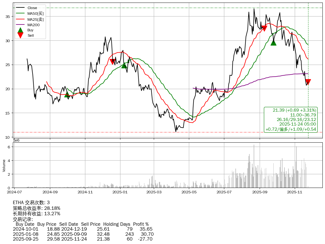 | 41 | ★ETHA | $22.48(+1.78 +8.60%) 11-24 14:59 20.70 11-21 | 📉回撤 08-24 -41.54% (91天) 36.58(08-21)→20.70(11-20) | +28.18% | +13.27% | +14.92% | 3 | 偏多/1.09/0.54 | 2024-07-23~2025-11-24 |