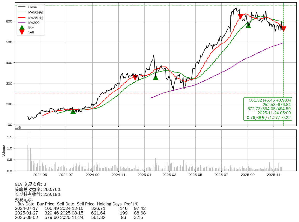 | 8 | ★GEV | $580.38(+23.80 +4.28%) 11-24 14:59 556.58 11-21 | 📉回撤 08-06 -15.41% (109天) 663.56(08-05)→547.80(11-03) | +260.76% | +239.19% | +21.57% | 3 | 偏多/1.27/0.22 | 2024-04-02~2025-11-24 |