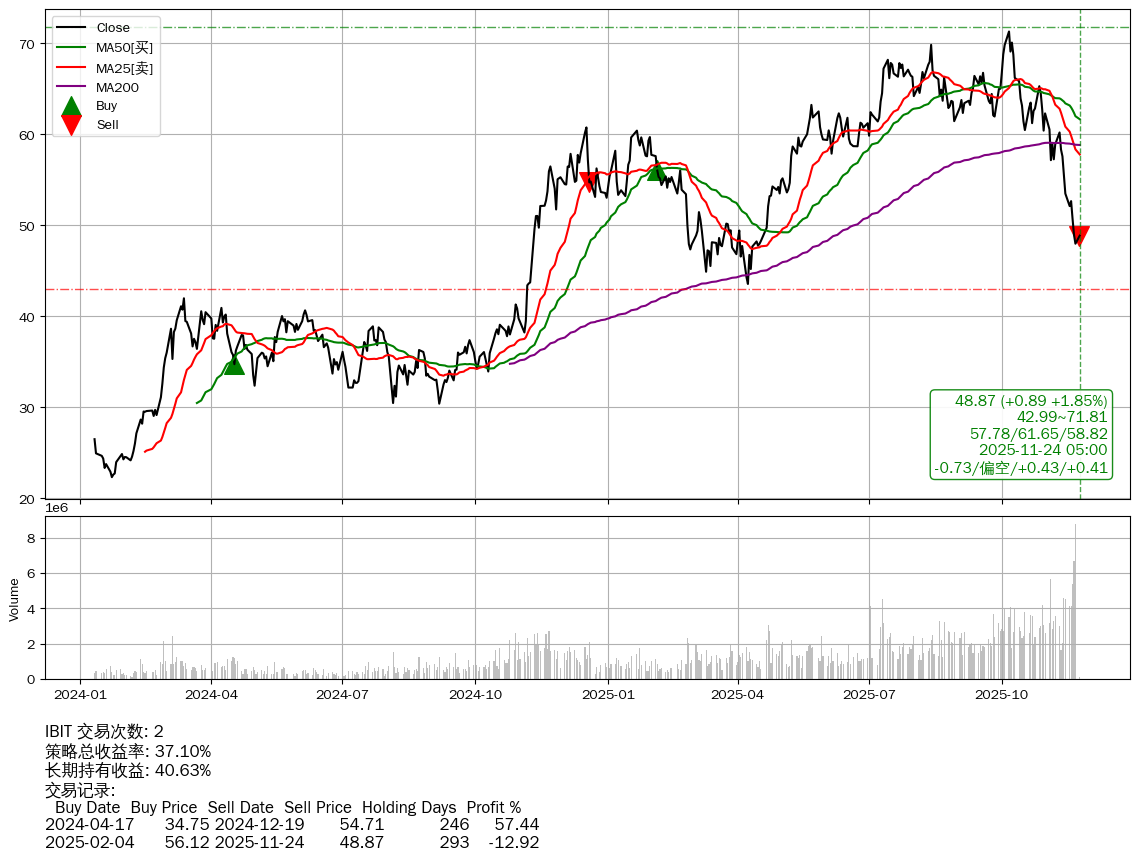 | 40 | ★IBIT | $50.58(+2.60 +5.42%) 11-24 14:59 47.98 11-21 | 📉回撤 10-06 -31.45% (48天) 71.29(10-05)→47.98(11-20) | +37.10% | +40.63% | -3.53% | 2 | 偏空/0.43/0.41 | 2024-01-11~2025-11-24 |