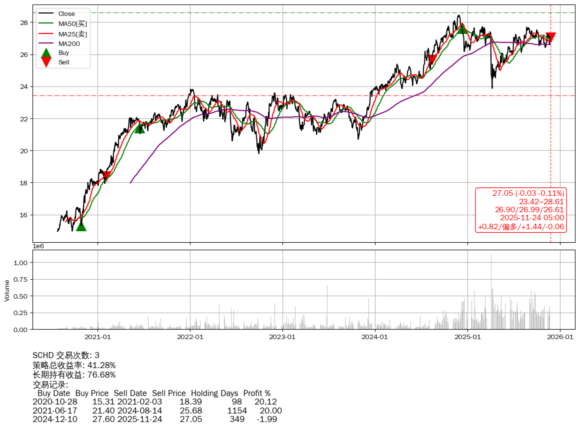 | 39 | ★SCHD | $26.97(-0.12 -0.44%) 11-24 14:59 27.09 11-21 | 📉跌破 MA10 均线 📉回撤 2024-12-01 -4.85% (357天) 28.43(2024-11-28)→23.87(04-07) | +41.28% | +76.68% | -35.41% | 3 | 偏多/1.44/-0.06 | 2020-07-27~2025-11-24 |
