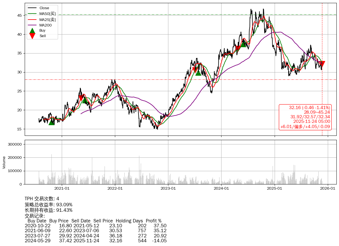 | 30 | TPH | $32.18(-0.45 -1.38%) 11-24 14:59 32.63 11-21 | 📉跌破 MA50/200 均线 📉回撤 2024-10-16 -31.12% (403天) 46.69(2024-10-15)→28.98(04-07) | +93.09% | +91.43% | +1.66% | 4 | 偏多/4.05/-0.09 | 2020-07-27~2025-11-24 |