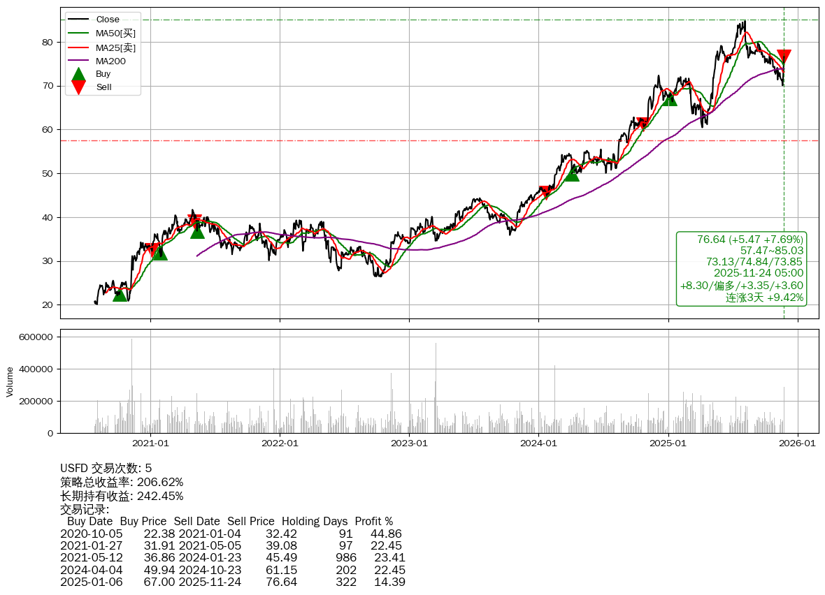 | 12 | 🟢USFD | $76.64(+5.53 +7.78%) 11-24 14:59 71.11 11-21 | 📈涨破 MA5/10/25/50/200 均线 📈连涨3天 +9.42% 📉回撤 08-06 -9.59% (109天) 84.77(08-05)→70.05(11-19) | +206.62% | +242.45% | -35.83% | 5 | 偏多/3.35/3.60 | 2020-07-27~2025-11-24 |