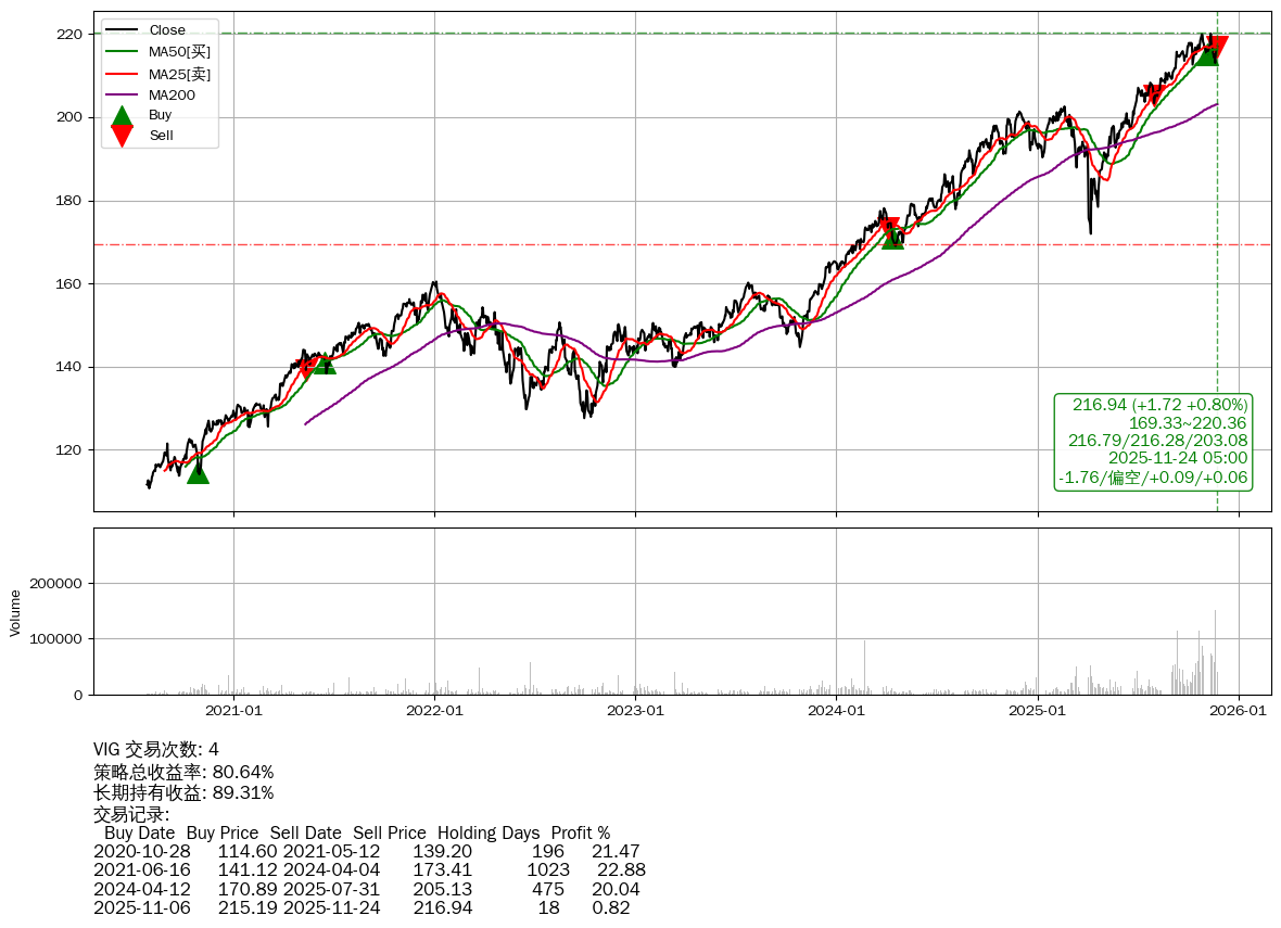 | 32 | ★VIG | $216.88(+1.58 +0.73%) 11-24 14:59 215.30 11-21 | 📈涨破 MA10/25/50 均线 📉回撤 11-12 -1.43% (11天) 220.10(11-11)→213.03(11-19) | +80.64% | +89.31% | -8.66% | 4 | 偏空/0.09/0.06 | 2020-07-27~2025-11-24 |