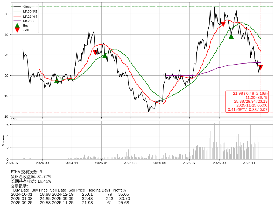 | 41 | ★ETHA | $22.16(-0.32 -1.42%) 11-25 14:59 22.48 11-24 | 📉回撤 08-24 -39.90% (92天) 36.58(08-21)→20.70(11-20) | +31.77% | +16.45% | +15.32% | 3 | 偏空/0.83/-0.07 | 2024-07-23~2025-11-25 |