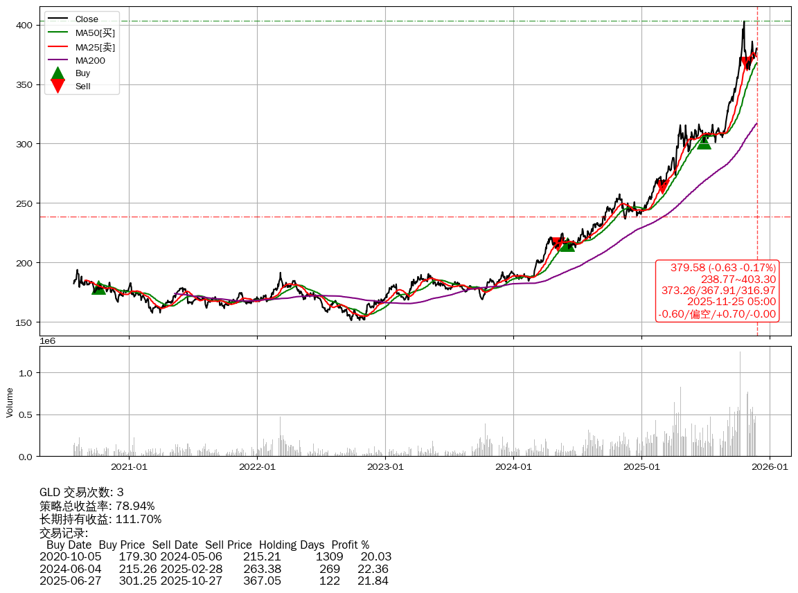 | 33 | ★GLD | $380.06(-0.10 -0.03%) 11-25 14:59 380.16 11-24 | 📉回撤 10-20 -5.80% (35天) 402.95(10-19)→362.27(11-03) | +78.94% | +111.70% | -32.76% | 3 | 偏空/0.7/-0.00 | 2020-07-27~2025-11-25 |