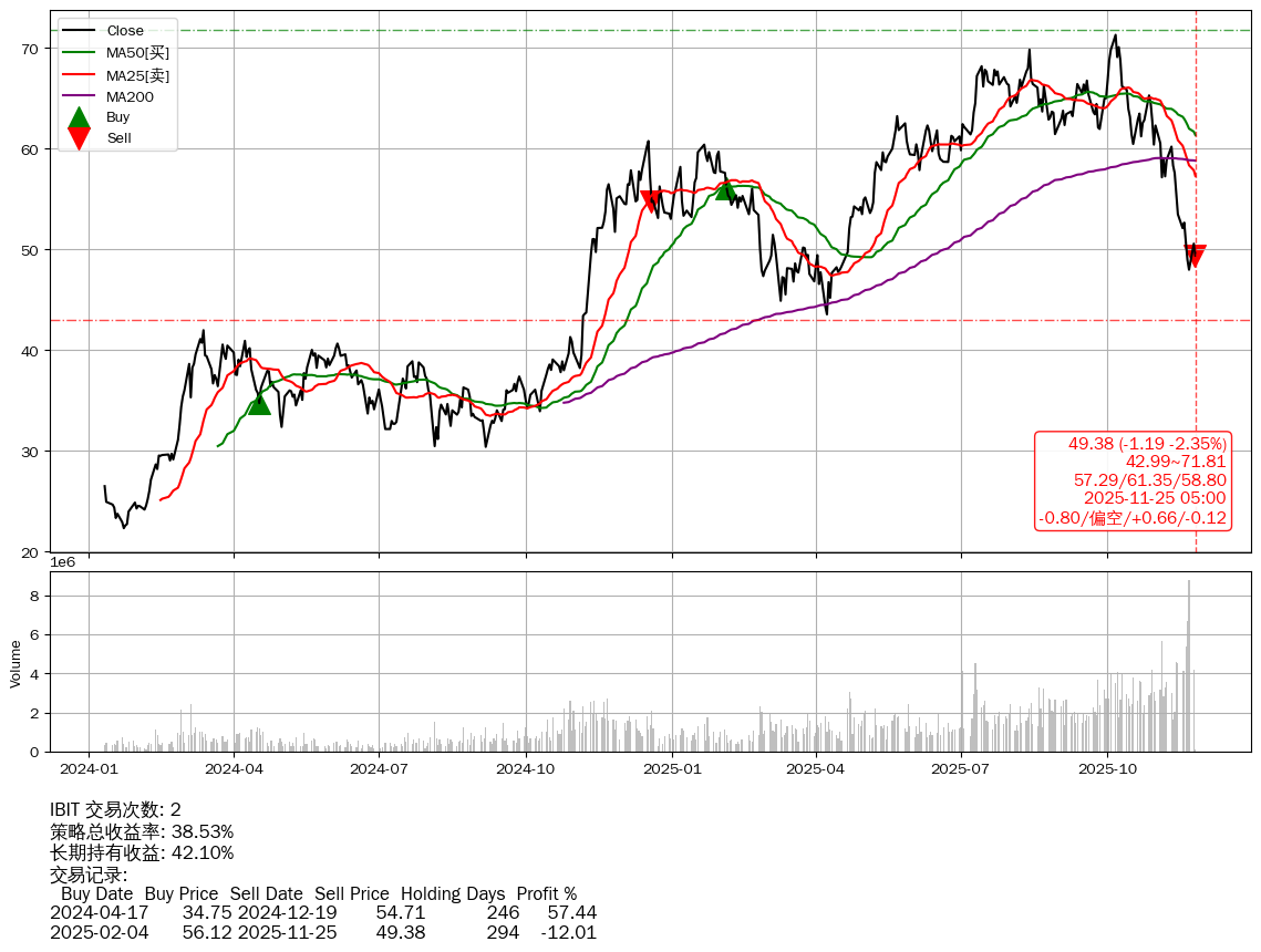 | 40 | ★IBIT | $49.55(-1.03 -2.04%) 11-25 14:59 50.58 11-24 | 📉跌破 MA5 均线 📉回撤 10-06 -30.73% (49天) 71.29(10-05)→47.98(11-20) | +38.53% | +42.10% | -3.57% | 2 | 偏空/0.66/-0.12 | 2024-01-11~2025-11-25 |