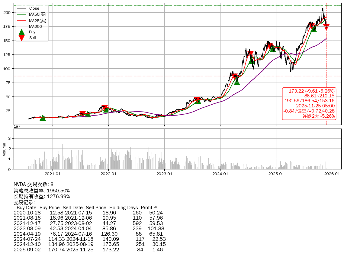 | 1 | ★NVDA | $177.80(-4.75 -2.60%) 11-25 14:59 182.55 11-24 | 📉跌破 MA5/100 均线 📉连跌2天 -5.26% 📉回撤 10-29 -16.33% (26天) 207.03(10-28)→173.22(11-24) | +1950.50% | +1276.99% | +673.52% | 8 | 偏空/0.72/-0.28 | 2020-07-27~2025-11-25 |