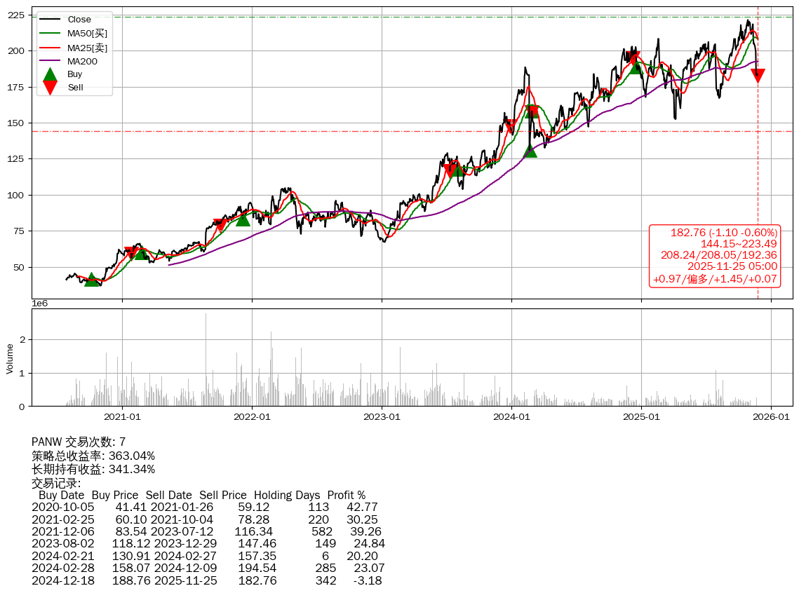 | 5 | ★PANW | $186.27(+2.37 +1.29%) 11-25 14:59 183.90 11-24 | 📉回撤 10-28 -17.43% (27天) 221.34(10-27)→182.76(11-24) | +363.04% | +341.34% | +21.70% | 7 | 偏多/1.44/0.07 | 2020-07-27~2025-11-25 |