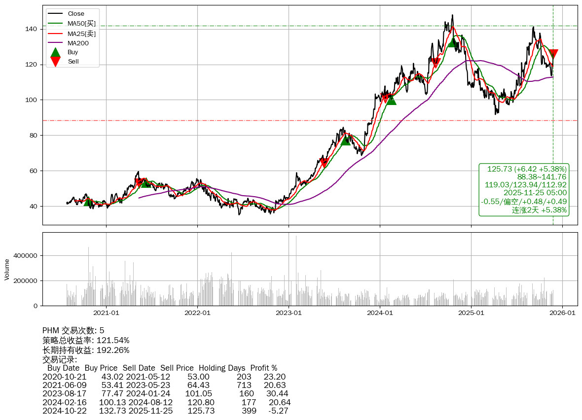 | 24 | 🟢PHM | $125.72(+6.44 +5.40%) 11-25 14:59 119.28 11-24 | 📈涨破 MA50/100 均线 📈连涨2天 +5.38% 📉回撤 2024-10-20 -15.00% (400天) 147.92(2024-10-17)→91.70(04-07) | +121.54% | +192.26% | -70.72% | 5 | 偏空/0.48/0.49 | 2020-07-27~2025-11-25 |