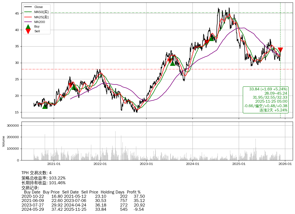| 30 | TPH | $33.84(+1.66 +5.16%) 11-25 14:59 32.18 11-24 | 📈涨破 MA50/100/200 均线 📈连涨2天 +5.24% 📉回撤 2024-10-16 -27.51% (404天) 46.69(2024-10-15)→28.98(04-07) | +103.22% | +101.46% | +1.77% | 4 | 偏空/0.48/0.38 | 2020-07-27~2025-11-25 |