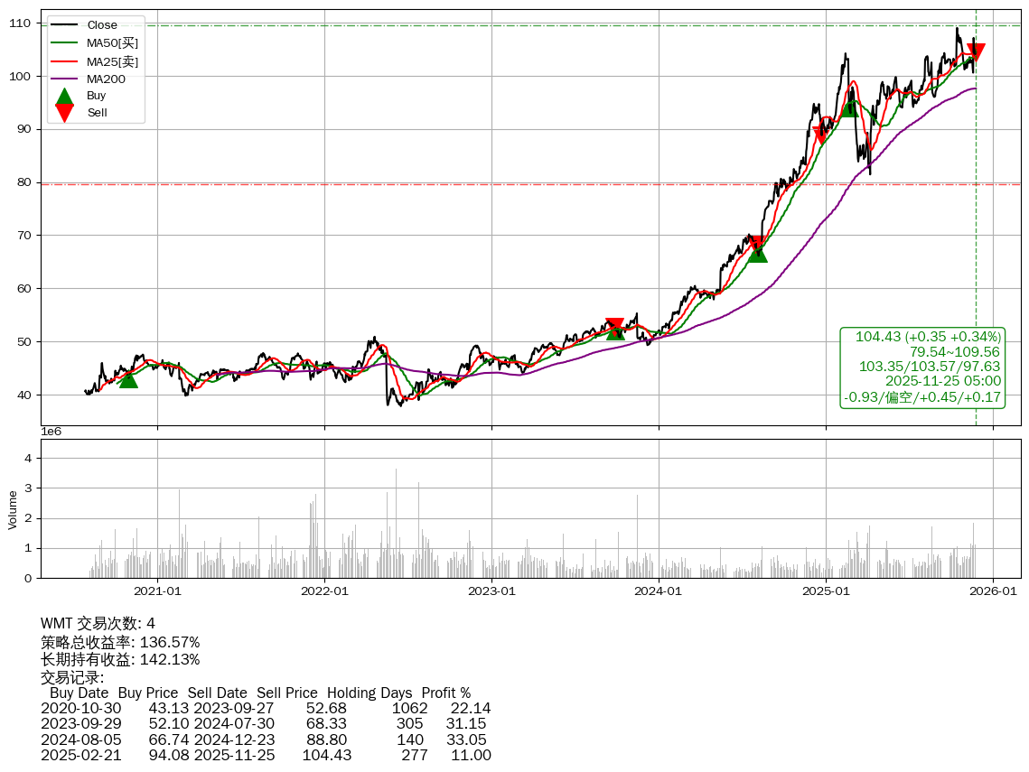 | 21 | ★WMT | $106.97(+2.89 +2.78%) 11-25 14:59 104.08 11-24 | 📈涨破 MA5 均线 📉回撤 10-15 -4.22% (40天) 109.03(10-14)→100.59(11-18) | +136.57% | +142.13% | -5.56% | 4 | 偏空/0.45/0.17 | 2020-07-27~2025-11-25 |