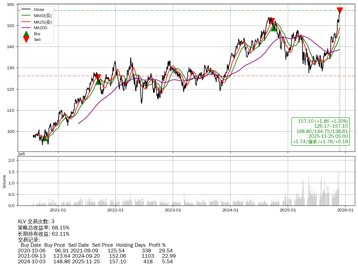 | 35 | ★XLV | $158.76(+3.52 +2.27%) 11-25 14:59 155.24 11-24 | 📈涨破 52周高点 (157.15) | +68.15% | +62.11% | +6.03% | 3 | 偏多/1.78/0.18 | 2020-07-27~2025-11-25 |