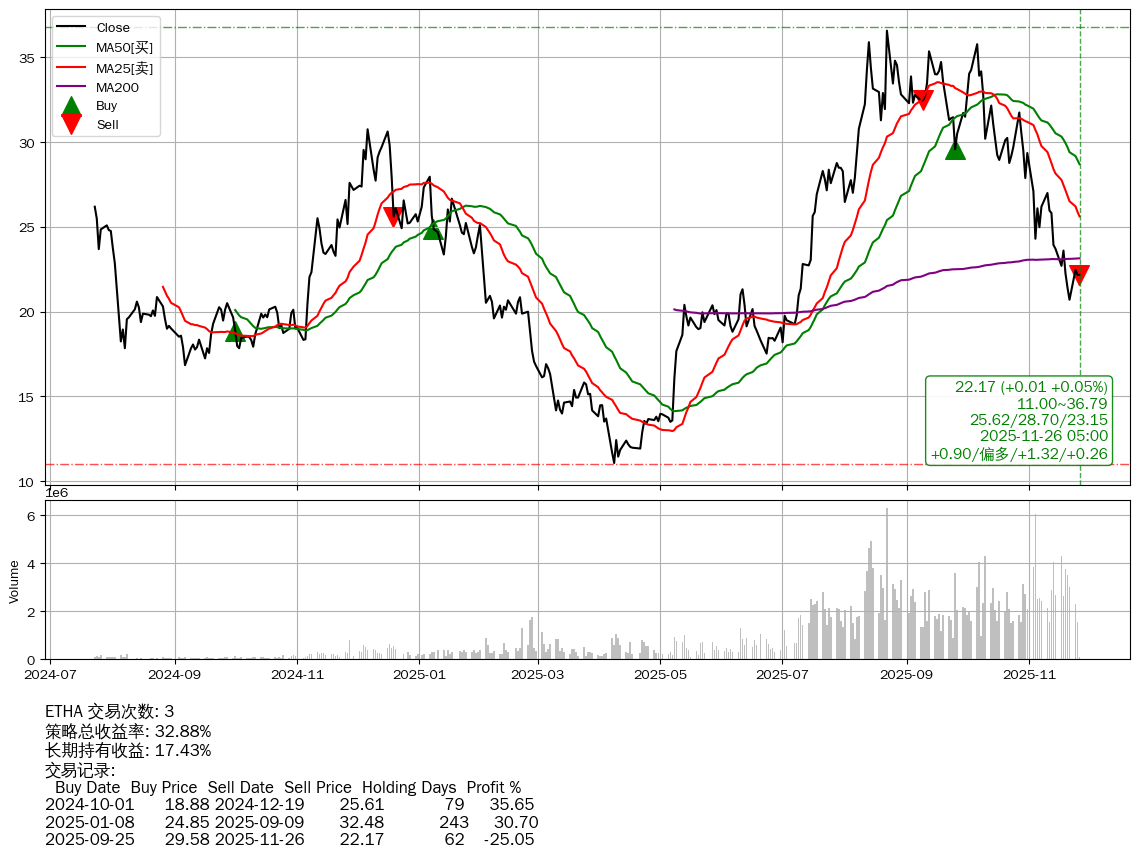 | 42 | ★ETHA | $22.89(+0.73 +3.29%) 11-26 14:59 22.16 11-25 | 📉回撤 08-24 -39.39% (93天) 36.58(08-21)→20.70(11-20) | +32.88% | +17.43% | +15.46% | 3 | 偏多/1.32/0.26 | 2024-07-23~2025-11-26 |