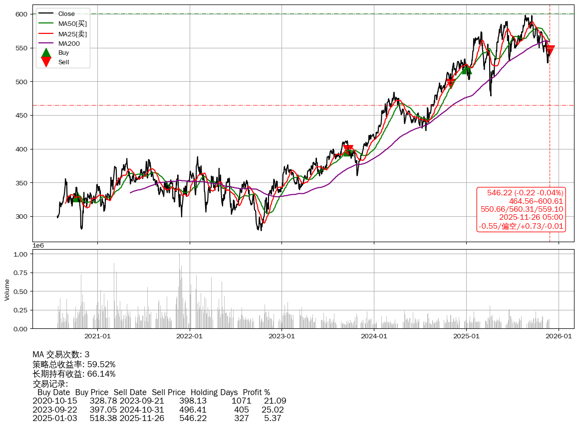 | 37 | ★MA | $545.09(-1.33 -0.24%) 11-26 14:59 546.42 11-25 | 📉回撤 08-24 -8.67% (93天) 598.06(08-21)→527.52(11-17) | +59.52% | +66.14% | -6.62% | 3 | 偏空/0.73/-0.01 | 2020-07-27~2025-11-26 |