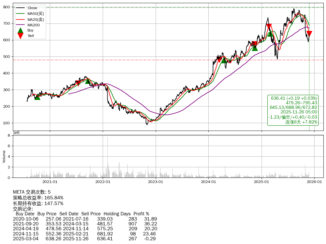 | 19 | ★META | $633.55(-2.67 -0.42%) 11-26 14:59 636.22 11-25 | 📈连涨6天 +7.82% 📉回撤 08-12 -19.37% (105天) 789.26(08-11)→589.15(11-19) | +165.84% | +147.57% | +18.27% | 5 | 偏空/0.4/-0.03 | 2020-07-27~2025-11-26 |