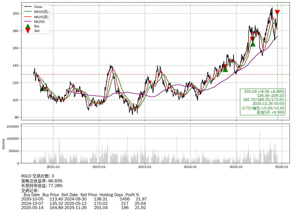 | 32 | 🟢RGLD | $200.95(+8.48 +4.41%) 11-26 14:59 192.47 11-25 | 📈连涨5天 +9.39% 📉回撤 10-16 -2.70% (40天) 206.61(10-15)→169.03(11-03) | +86.83% | +77.28% | +9.55% | 3 | 偏空/0.44/0.42 | 2020-07-27~2025-11-26 |
