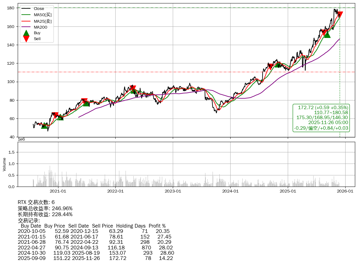 | 11 | ★RTX | $173.17(+1.04 +0.60%) 11-26 14:59 172.13 11-25 | 📉回撤 10-23 -3.35% (33天) 178.71(10-22)→169.68(11-20) | +246.96% | +228.44% | +18.52% | 6 | 偏空/0.82/0.03 | 2020-07-27~2025-11-26 |