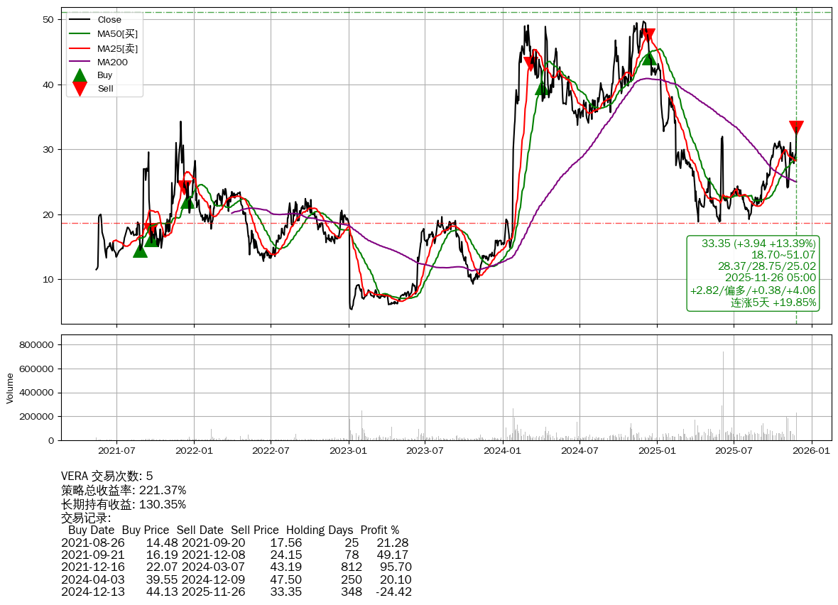 | 12 | 🟢VERA | $33.33(+3.90 +13.25%) 11-26 14:59 29.43 11-25 | 📈涨破 MA5 均线 📈连涨5天 +19.85% 📉回撤 2024-12-01 -32.87% (359天) 49.69(2024-11-28)→18.86(04-07) | +221.37% | +130.35% | +91.02% | 5 | 偏多/0.38/4.06 | 2021-05-14~2025-11-26 |