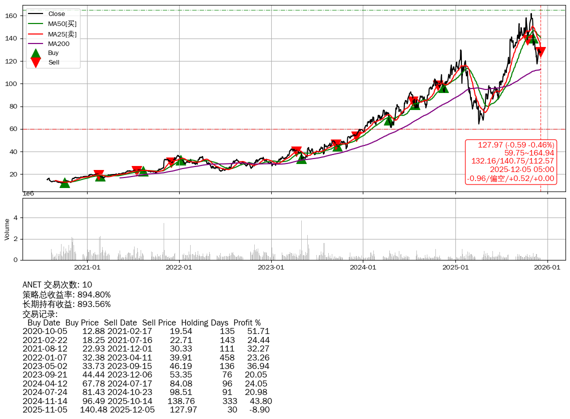 | 2 | ★ANET | $128.57(-0.04 -0.03%) 12-05 14:59 128.60 12-04 | 📉回撤 10-29 -21.00% (36天) 161.99(10-28)→117.43(11-20) | +894.80% | +893.56% | +1.25% | 10 | 偏空/0.53/0.00 | 2020-07-27~2025-12-05 |