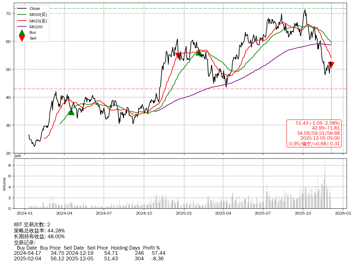| 38 | ★IBIT | $50.70(-1.81 -3.45%) 12-05 14:59 52.51 12-04 | 📉回撤 10-06 -27.86% (59天) 71.29(10-05)→47.98(11-20) | +44.28% | +48.00% | -3.72% | 2 | 偏空/0.68/-0.31 | 2024-01-11~2025-12-05 |