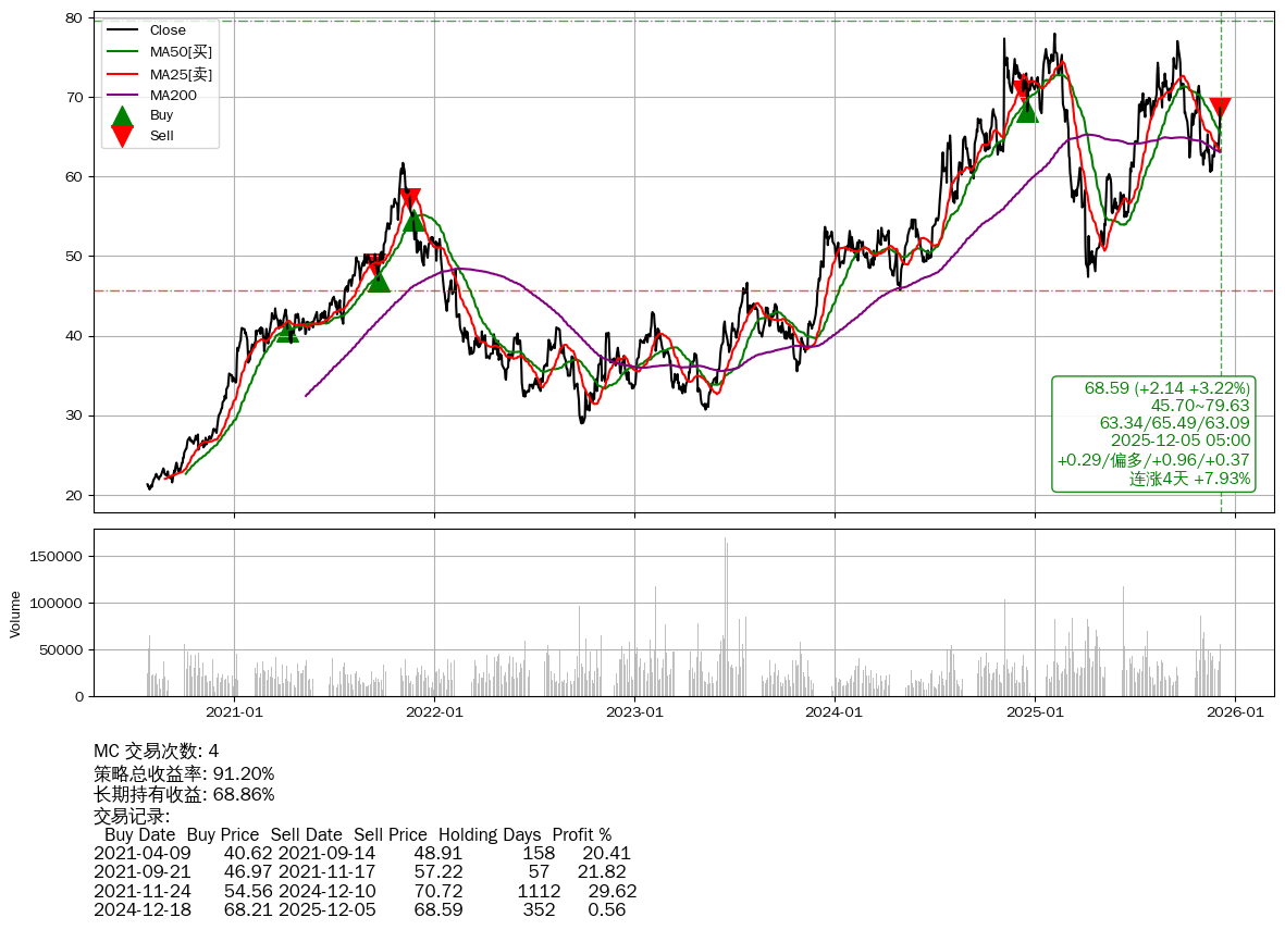 | 29 | 🟢MC | $68.71(+2.27 +3.42%) 12-05 14:59 66.44 12-04 | 📈涨破 MA100 均线 📈连涨4天 +7.93% 📉回撤 02-06 -12.03% (301天) 77.97(02-05)→47.39(04-07) | +91.20% | +68.86% | +22.34% | 4 | 偏多/0.96/0.37 | 2020-07-27~2025-12-05 |