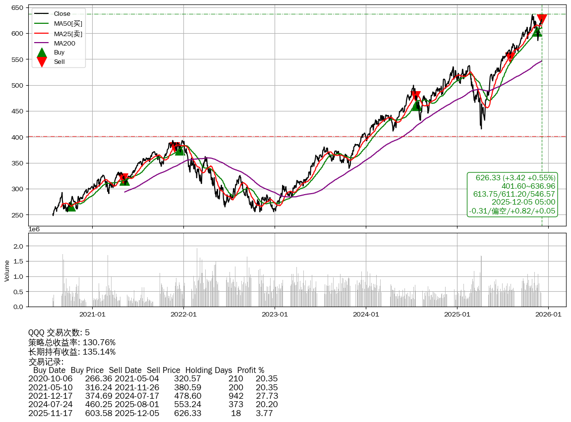 | 23 | ★QQQ | $625.53(+2.67 +0.43%) 12-05 14:59 622.86 12-04 | 📉回撤 10-29 -1.50% (36天) 635.87(10-28)→585.82(11-19) | +130.76% | +135.14% | -4.38% | 5 | 偏空/0.82/0.05 | 2020-07-27~2025-12-05 |