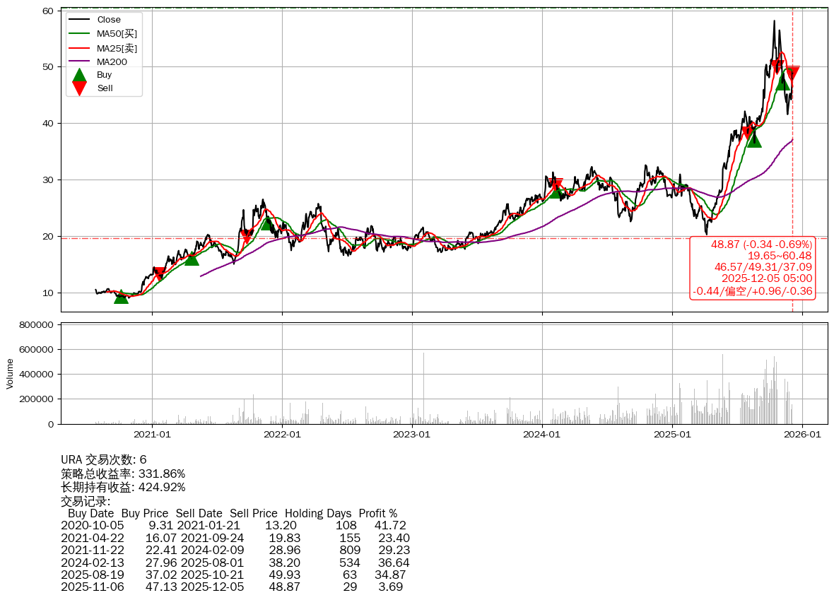 | 7 | ★URA | $47.89(-1.33 -2.70%) 12-05 14:59 49.22 12-04 | 📉回撤 10-15 -15.99% (50天) 58.17(10-14)→41.56(11-20) | +331.86% | +424.92% | -93.06% | 6 | 偏空/0.96/-0.36 | 2020-07-27~2025-12-05 |