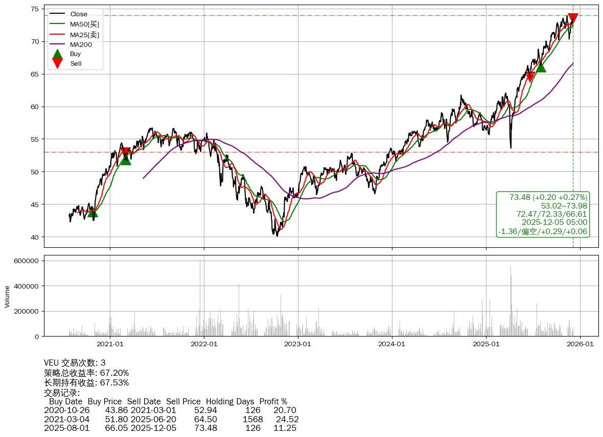 | 33 | 🟢VEU | $73.48(+0.19 +0.26%) 12-05 14:59 73.29 12-04 | 📉回撤 11-12 -0.60% (22天) 73.92(11-11)→70.31(11-19) | +67.20% | +67.53% | -0.33% | 3 | 偏空/0.29/0.06 | 2020-07-27~2025-12-05 |