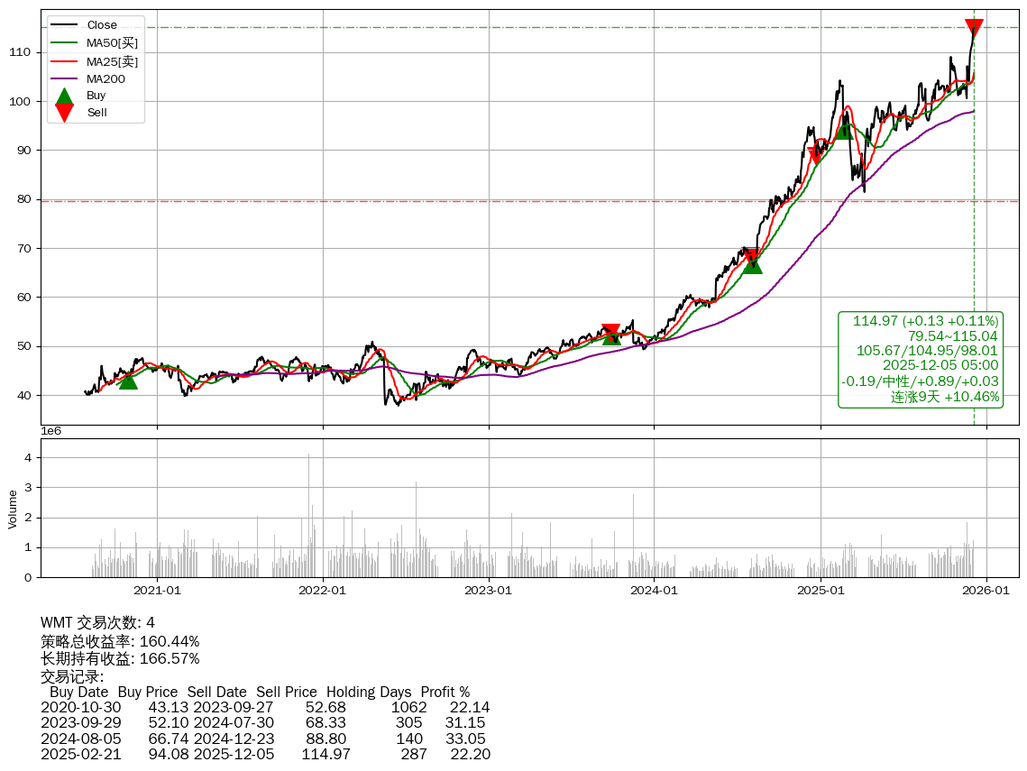 | 20 | ★WMT | $115.11(+0.27 +0.24%) 12-05 14:59 114.84 12-04 | 📈涨破 52周高点 (115.04) 📈连涨9天 +10.46% | +160.44% | +166.57% | -6.12% | 4 | 中性/0.89/0.03 | 2020-07-27~2025-12-05 |