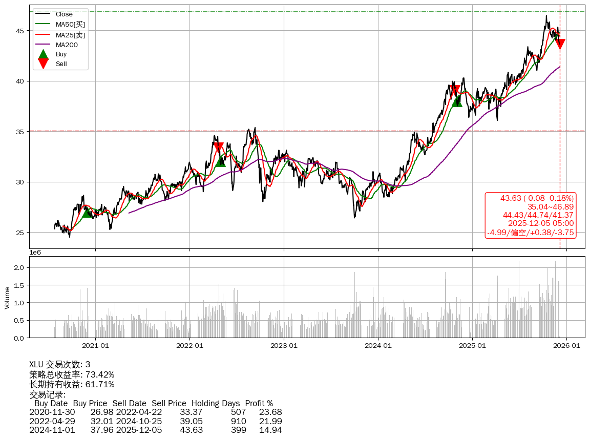 | 32 | ★XLU | $43.29(-44.14 -50.49%) 12-05 14:59 87.43 12-04 | 📉回撤 10-15 -6.05% (50天) 46.44(10-14)→43.63(12-04) | +73.42% | +61.71% | +11.71% | 3 | 偏空/0.38/-3.75 | 2020-07-27~2025-12-05 |