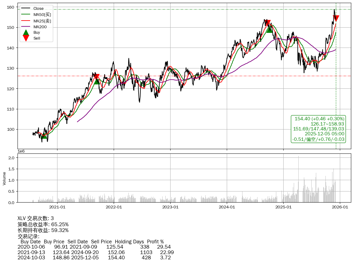 | 34 | ★XLV | $153.27(-0.65 -0.42%) 12-05 14:59 153.92 12-04 | 📉回撤 11-25 -2.75% (9天) 158.76(11-24)→153.94(12-03) | +65.25% | +59.32% | +5.93% | 3 | 偏空/0.76/-0.03 | 2020-07-27~2025-12-05 |
