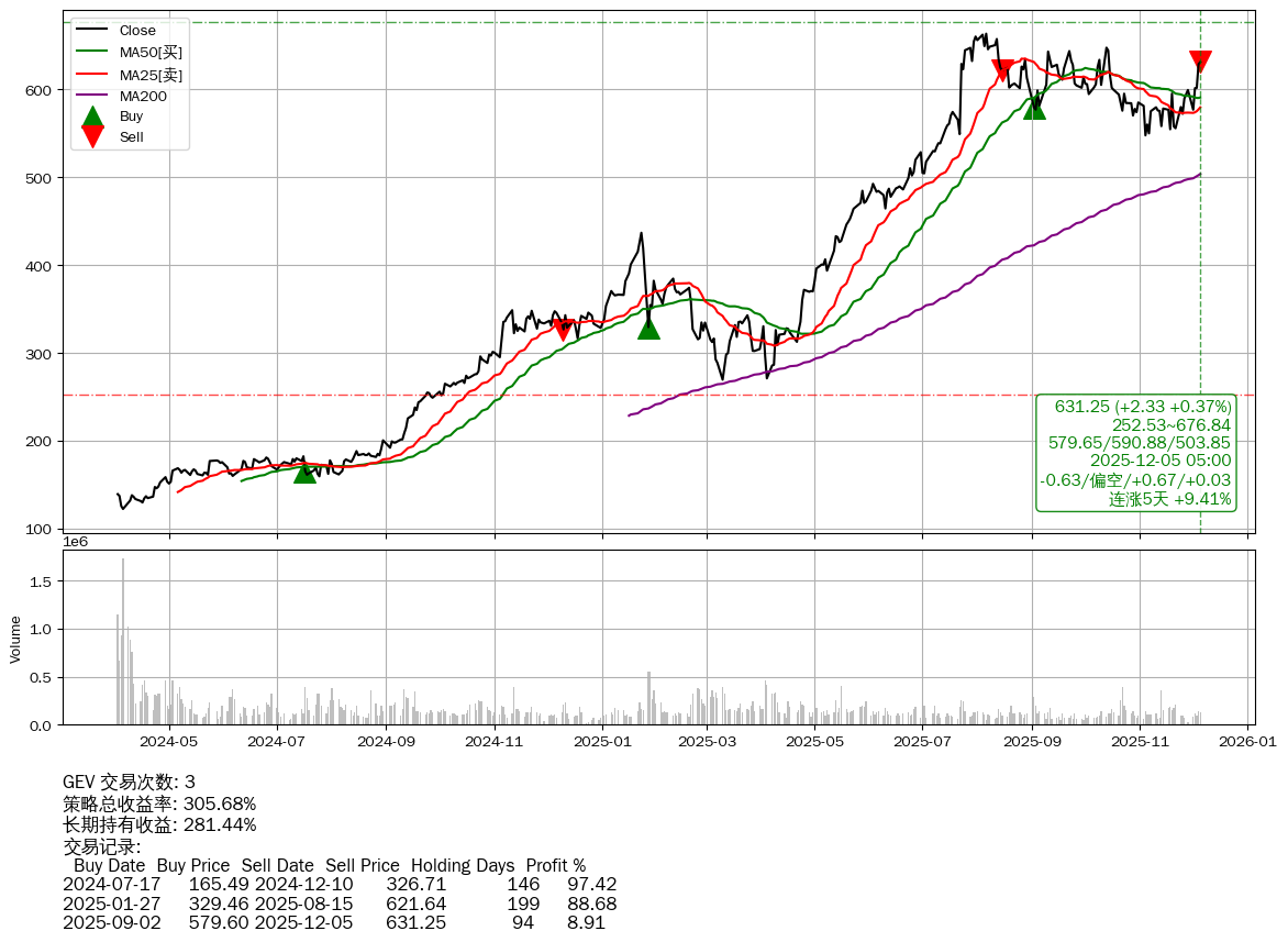 | 10 | ★GEV | $631.34(+2.05 +0.33%) 12-05 14:59 629.29 12-04 | 📈连涨5天 +9.41% 📉回撤 08-06 -4.87% (120天) 663.56(08-05)→547.80(11-03) | +305.68% | +281.44% | +24.24% | 3 | 偏空/0.67/0.03 | 2024-04-02~2025-12-05 |