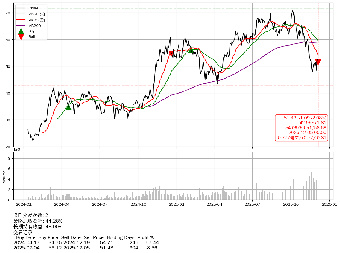 | 46 | ★IBIT | $50.70(-1.81 -3.45%) 12-05 14:59 52.51 12-04 | 📉回撤 10-06 -27.86% (59天) 71.29(10-05)→47.98(11-20) | +44.28% | +48.00% | -3.72% | 2 | 偏空/0.77/-0.31 | 2024-01-11~2025-12-05 |