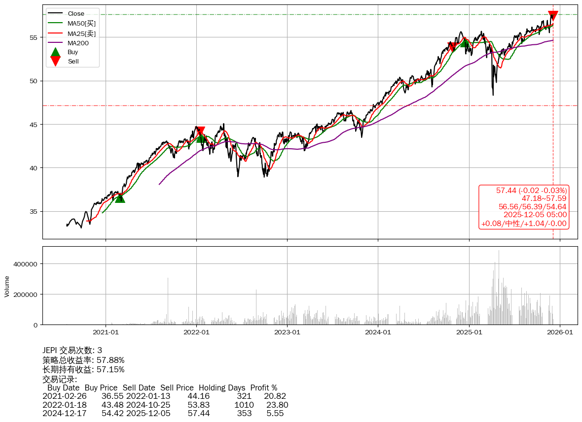 | 42 | ★JEPI | $57.43(-0.03 -0.05%) 12-05 14:59 57.46 12-04 | 📈涨破 52周高点 (57.59) 📉回撤 11-30 -0.14% (4天) 57.52(11-27)→57.16(12-01) | +57.88% | +57.15% | +0.72% | 3 | 中性/1.04/-0.00 | 2020-07-28~2025-12-05 |