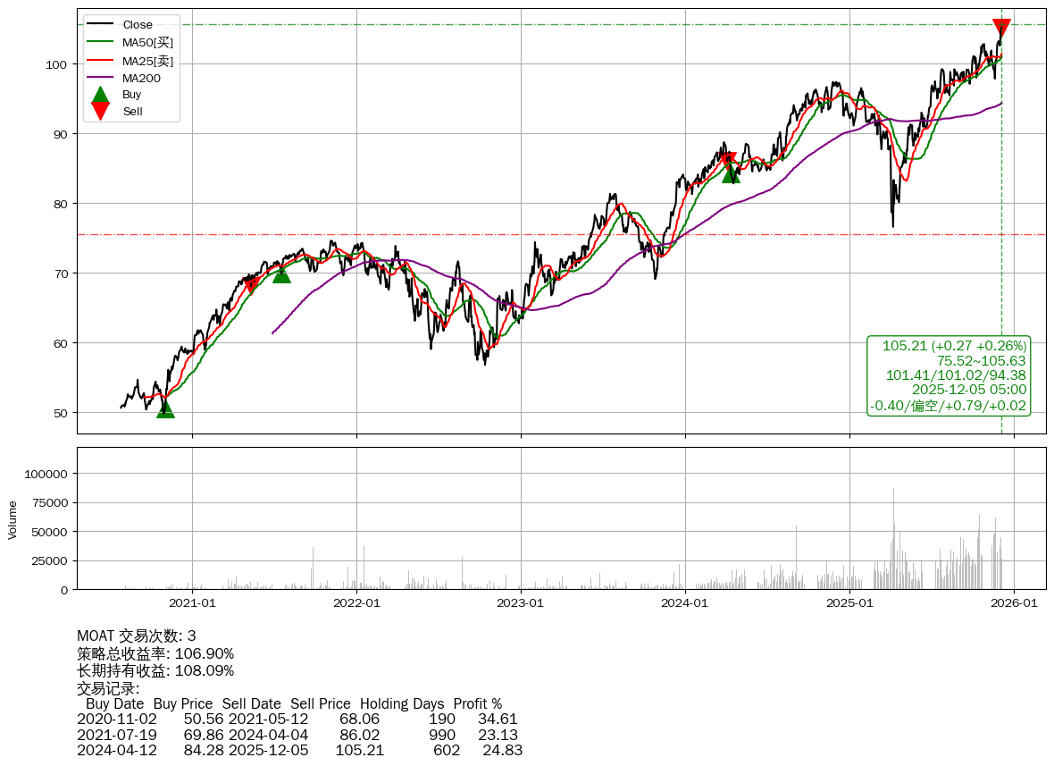 | 32 | ★MOAT | $105.19(+0.24 +0.23%) 12-05 14:59 104.96 12-04 | 📈涨破 52周高点 (105.63) | +106.90% | +108.09% | -1.19% | 3 | 偏空/0.79/0.02 | 2020-07-27~2025-12-05 |