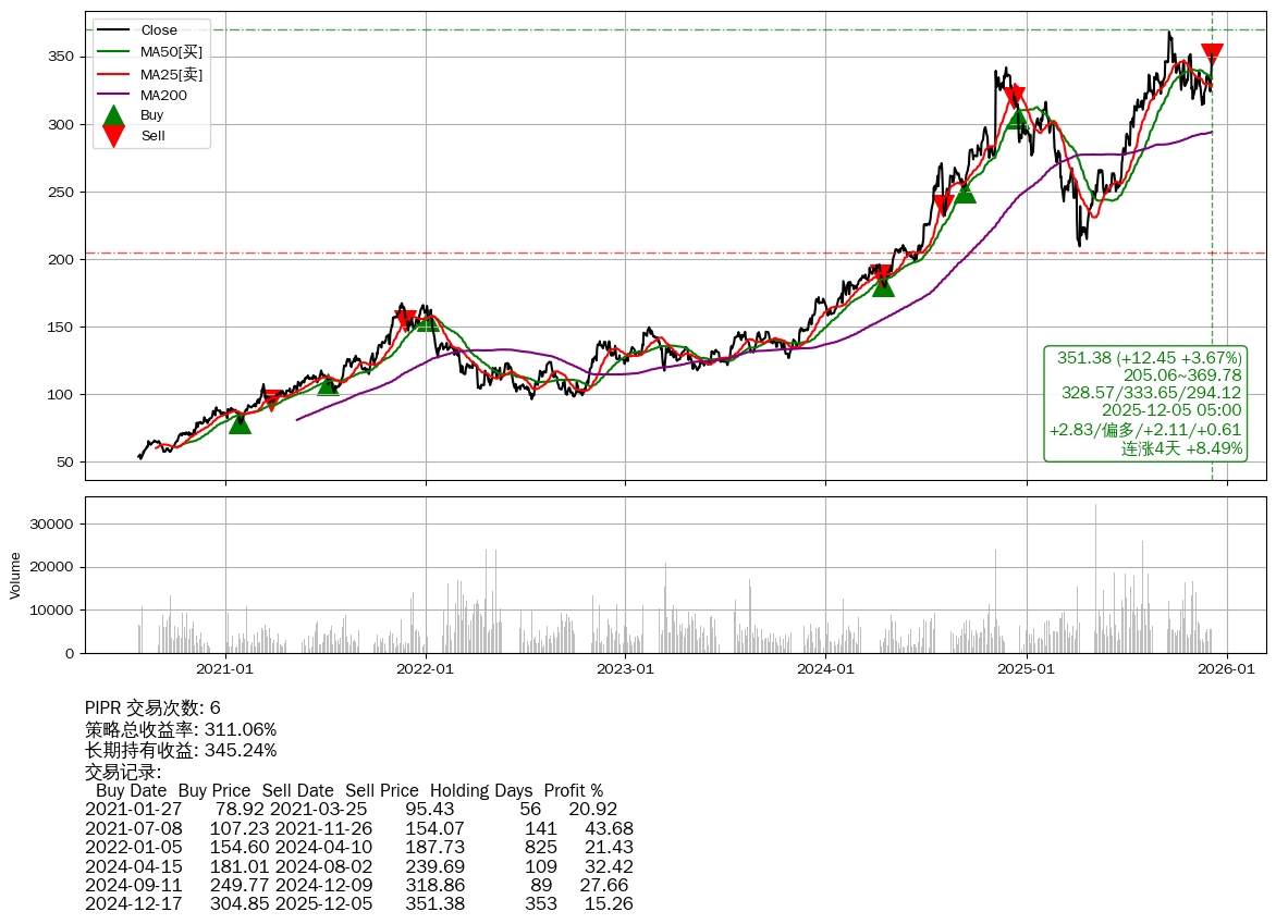 | 9 | PIPR | $351.24(+12.60 +3.72%) 12-05 14:59 338.65 12-04 | 📈连涨4天 +8.49% 📉回撤 09-18 -4.51% (77天) 367.99(09-17)→313.98(11-16) | +311.06% | +345.24% | -34.17% | 6 | 偏多/2.11/0.61 | 2020-07-27~2025-12-05 |