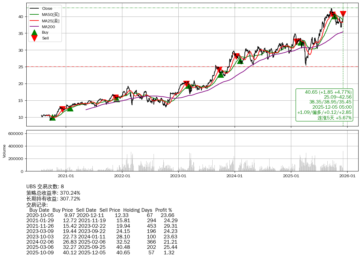 | 7 | UBS | $40.65(+1.85 +4.77%) 12-05 14:59 38.80 12-04 | 📈涨破 MA5/50/100 均线 📈连涨5天 +5.67% 📉回撤 09-22 -4.06% (73天) 42.37(09-21)→36.78(11-23) | +370.24% | +307.72% | +62.51% | 8 | 偏多/0.12/2.85 | 2020-07-27~2025-12-05 |