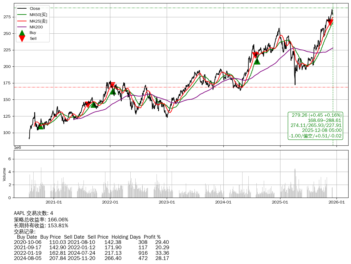 | 18 | ★AAPL | $277.96(-0.83 -0.30%) 12-08 14:59 278.79 12-05 | 📉回撤 12-02 -2.39% (5天) 286.09(12-01)→278.81(12-04) | +166.06% | +153.81% | +12.25% | 4 | 偏空/0.51/-0.02 | 2020-07-27~2025-12-08 |