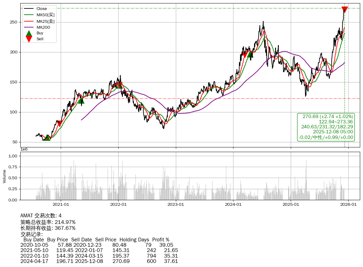 | 13 | ★AMAT | $268.17(+0.30 +0.11%) 12-08 14:59 267.87 12-05 | 📈涨破 MA5 均线 | +214.97% | +367.67% | -152.71% | 4 | 中性/0.99/0.00 | 2020-07-27~2025-12-08 |