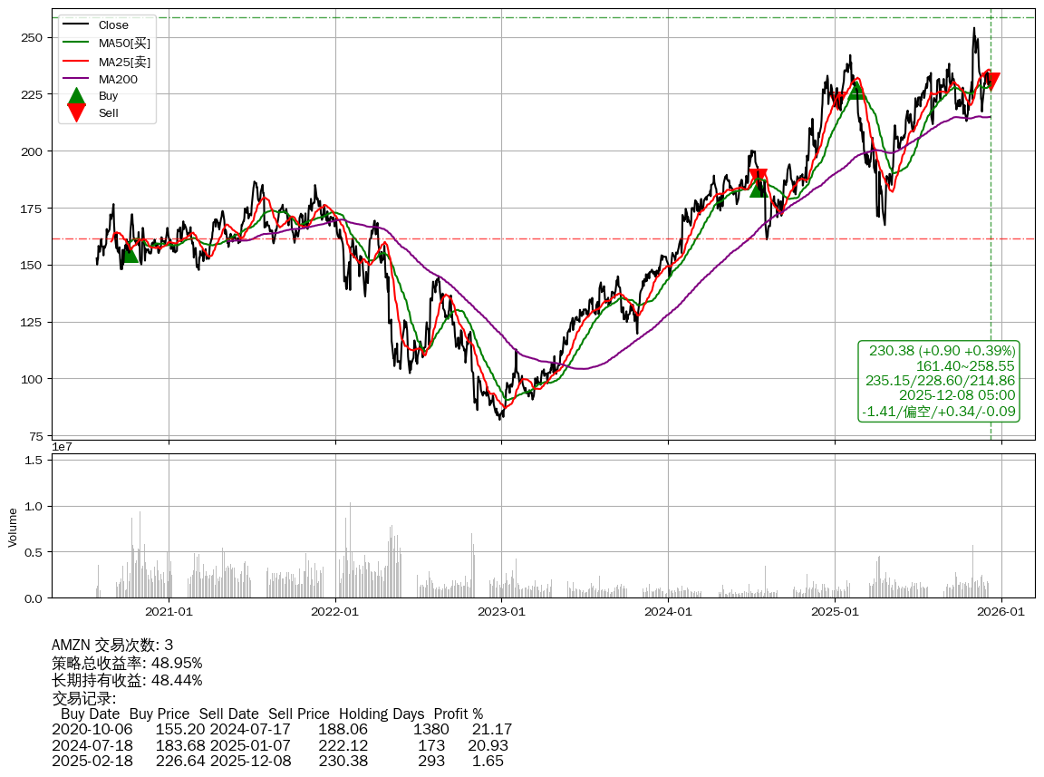| 41 | ★AMZN | $226.99(-2.56 -1.12%) 12-08 14:59 229.55 12-05 | 📉回撤 11-03 -9.30% (34天) 253.99(11-02)→217.19(11-19) | +48.95% | +48.44% | +0.51% | 3 | 偏空/0.34/-0.09 | 2020-07-27~2025-12-08 |