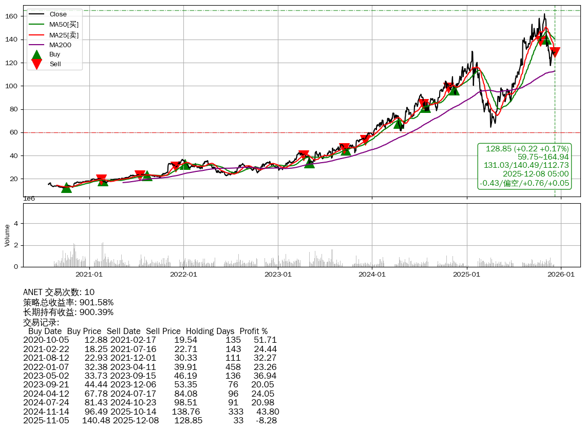 | 2 | ★ANET | $129.15(+0.58 +0.45%) 12-08 14:59 128.57 12-05 | 📉回撤 10-29 -20.46% (39天) 161.99(10-28)→117.43(11-20) | +901.58% | +900.39% | +1.19% | 10 | 偏空/0.75/0.05 | 2020-07-27~2025-12-08 |
