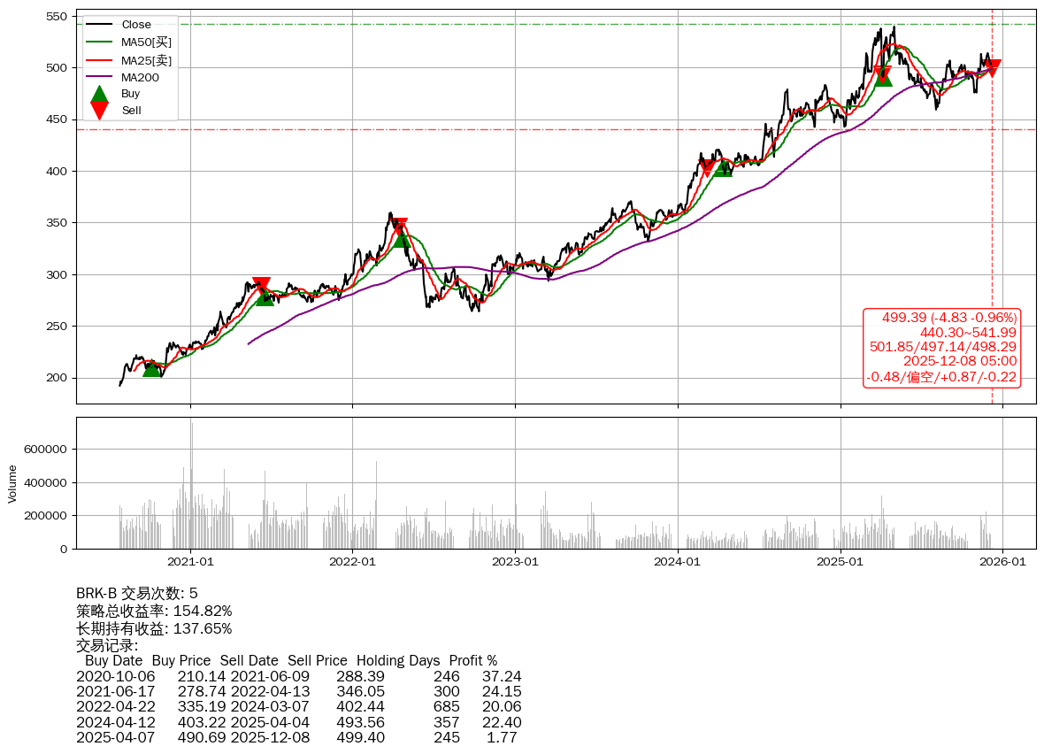 | 21 | ★BRK-B | $497.35(-6.97 -1.38%) 12-08 14:59 504.32 12-05 | 📉跌破 MA5/25 均线 📉回撤 05-04 -7.44% (217天) 539.56(05-01)→459.16(08-03) | +154.82% | +137.65% | +17.17% | 5 | 偏空/0.87/-0.22 | 2020-07-27~2025-12-08 |