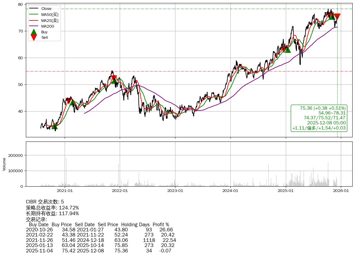 | 27 | ★CIBR | $75.24(+0.25 +0.33%) 12-08 14:59 74.99 12-05 | 📉回撤 10-08 -3.61% (60天) 78.19(10-07)→71.47(11-19) | +124.72% | +117.94% | +6.78% | 5 | 偏多/1.54/0.03 | 2020-07-27~2025-12-08 |
